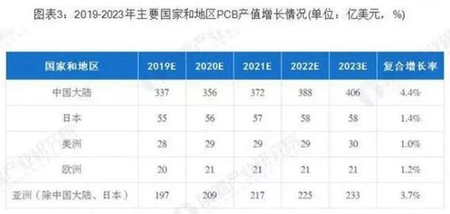 據(jù)Prismark預(yù)測,未來5年亞洲將繼續(xù)主導(dǎo)全球PCB市場的發(fā)展,而中國的核心地位更加穩(wěn)固,中國大陸地區(qū)PCB行業(yè)將保持4.4%的復(fù)合增長率,至2023年行業(yè)總產(chǎn)值將達到405.56億美元。在PCB公司"大型化、集中化"趨勢下,已較早確立領(lǐng)先優(yōu)勢的大型PCB公司將在未來全球市場競爭中取得較大優(yōu)勢。